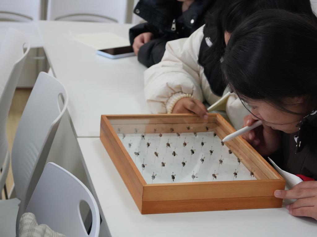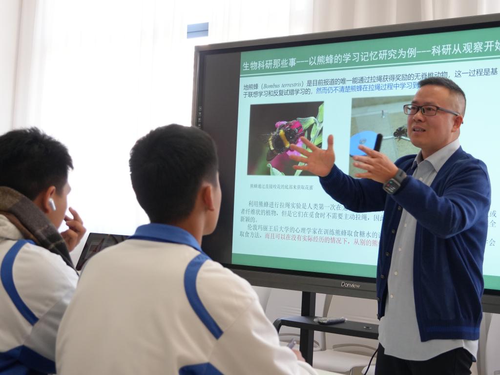 隨后,郭軍老師一邊展示雄蜂標(biāo)本一邊介紹了授粉熊蜂和熊蜂在設(shè)施果蔬中的應(yīng)用,帶領(lǐng)同學(xué)們研讀經(jīng)典論文中的結(jié)論:“實驗表明,數(shù)百只未經(jīng)訓(xùn)練的熊蜂,最初只有2只能成功拉繩獲取食物,但經(jīng)過循序漸進的訓(xùn)練,它們不僅能熟練掌握技巧,還會向同類‘學(xué)習(xí)’,而且只認同類的示范。”標(biāo)本的直觀呈現(xiàn)讓同學(xué)們真切感受到熊蜂的外形特征,其背后的科研故事更讓大家明白“勤學(xué)苦練”是所有物種都適用的生存法則。