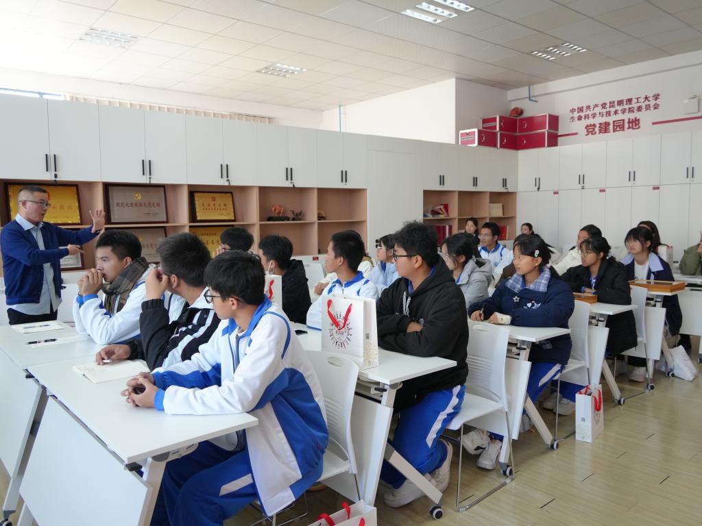 為落實校黨委《2025年鄉(xiāng)村振興工作要點》,進一步深化紅河縣教育幫扶工作,促進優(yōu)質(zhì)教育資源共享,助力教育優(yōu)質(zhì)發(fā)展和鄉(xiāng)村振興,2025年12月12日,由昆明理工大學(xué)鄉(xiāng)村振興研究院組織,生命科學(xué)與技術(shù)學(xué)院研教辦承辦,紅河縣第一中學(xué)的優(yōu)秀學(xué)生赴昆明理工大學(xué)生命科學(xué)與技術(shù)學(xué)院參觀學(xué)習(xí)。我院郭軍副教授為同學(xué)們講授主題為“千里之行始于足下”的科學(xué)家精神講座,通過熊蜂、中華蜜蜂、歐洲蜜蜂、黑大蜜蜂四類蜂類標(biāo)本展示,結(jié)合自身科研經(jīng)歷與成長故事,為同學(xué)們打造了一場兼具科普性與勵志性的深度分享會。