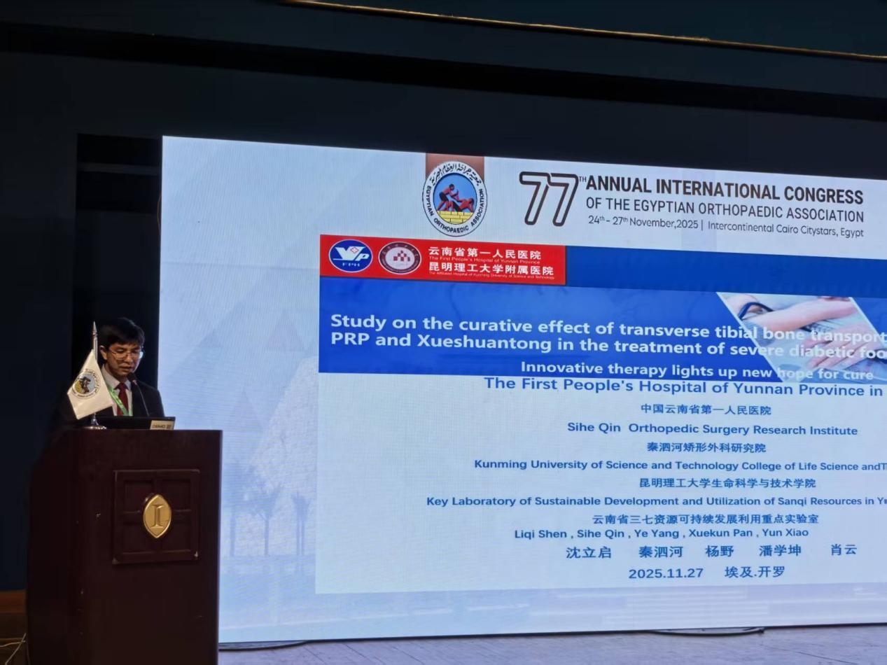 沈立啟同學是昆明理工大學附屬昆華醫(yī)院的副主任醫(yī)師,同時也是我院生物與醫(yī)藥專業(yè)碩士在校生,導師為楊野教授。此次,他在他國際骨科學會(EOA)上進行了題為《脛骨橫向骨搬運聯(lián)合三七皂苷治療重癥糖尿病足的臨床療效研究》的報告,匯報了Ilizarov外固定架技術與云南道地藥材三七結合治療糖尿病足的科研進展,體現(xiàn)了中西醫(yī)結合治療疾病的完美融合,得到了與會學者的高度認可與贊揚。