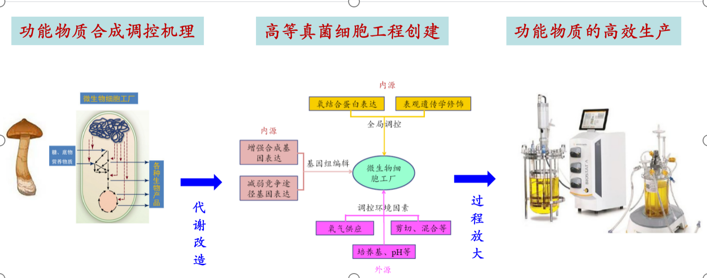 研究內(nèi)容:針對高等真菌次級代謝復(fù)雜、遺傳操作困難以及次級代謝產(chǎn)物產(chǎn)量低等問題,重點開展以下研究內(nèi)容:1)高等真菌活性功能物質(zhì)(多糖、三萜、木質(zhì)纖維素降解酶等)生物合成的調(diào)控機制研究;2)高效生產(chǎn)活性功能物質(zhì)的高等真菌細胞工廠的創(chuàng)制;3)高等真菌細胞工廠在反應(yīng)器培養(yǎng)環(huán)境的適配性以及高效生產(chǎn)活性功能物質(zhì)的新方法和新工藝。