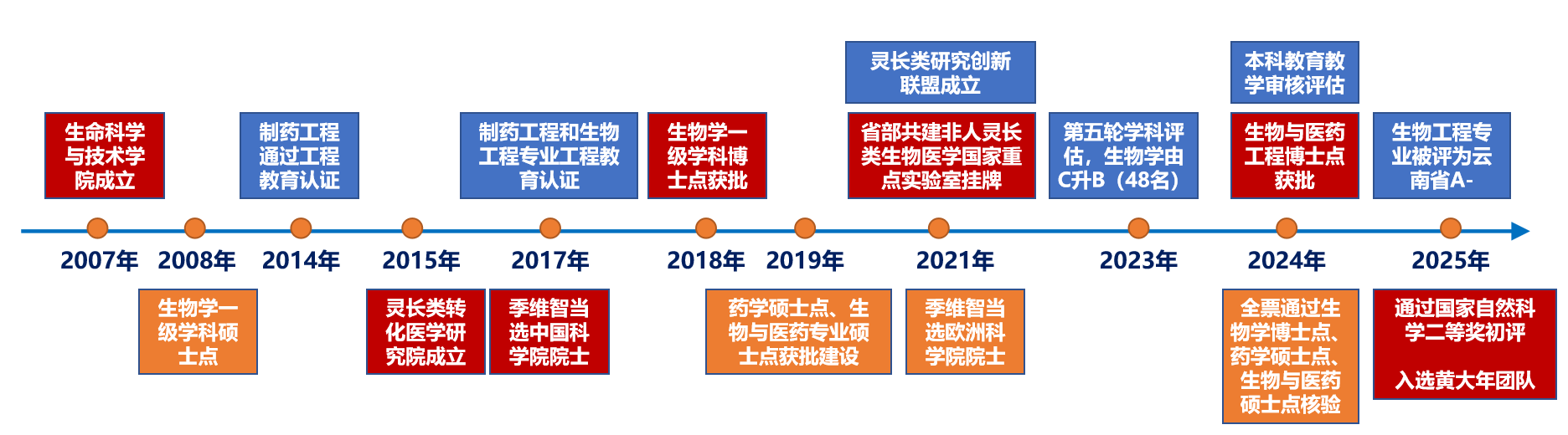 2007年生命科學(xué)與技術(shù)學(xué)院成立,2008年獲批生物學(xué)一級學(xué)科碩士點(diǎn),2014 年制藥工程通過工程教育認(rèn)證,2015年靈長類轉(zhuǎn)化醫(yī)學(xué)研究院成立,2017年季維智研究員當(dāng)選中國科學(xué)院院士,同年制藥工程和生物工程專業(yè)通過工程教育認(rèn)證。2018年生物學(xué)一級學(xué)科博士點(diǎn)獲批,2019年藥學(xué)碩士點(diǎn)、生物與醫(yī)藥專業(yè)碩士點(diǎn)獲批建設(shè)。2021年靈長類研究創(chuàng)新聯(lián)盟成立,省部共建非人靈長類生物學(xué)國家重點(diǎn)實(shí)驗(yàn)室掛牌,季維智研究員當(dāng)選歐洲科學(xué)院院士。2023年第五輪學(xué)科評估,生物學(xué)由C到B。2024年通過本科教育教學(xué)審核評估,獲批建設(shè)生物與醫(yī)藥專業(yè)學(xué)位博士點(diǎn),全票通過生物學(xué)博士點(diǎn),藥學(xué)、生物與醫(yī)藥碩士點(diǎn)核驗(yàn);2025年生物工程專業(yè)被評為云南省A-專業(yè),通過國家自然科學(xué)獎二等獎初評,入選黃大年式團(tuán)隊(duì)。